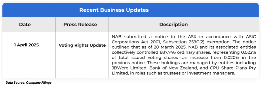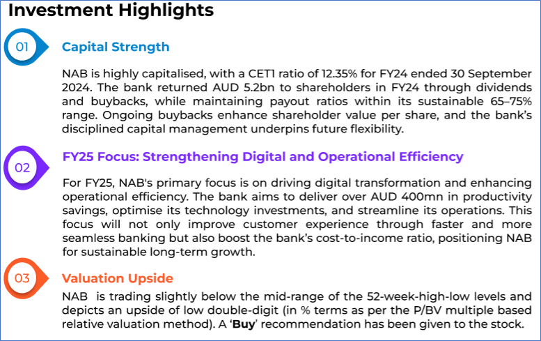 1.1: Company Overview: National Australia Bank Limited (ASX:NAB) is one of Australia’s largest financial institutions, offering comprehensive banking and financial services across Australia, New Zealand, and globally. With a focus on business and personal banking, NAB supports individuals, small businesses, and large corporations through innovative digital platforms and dedicated customer service. Kalkine’s Dividend Income Report covers the Investment Highlights, Management Insights, Key Financial Metrics, Risks, Technical Analysis along with the Valuation, Target Price, and Recommendation on the stock.