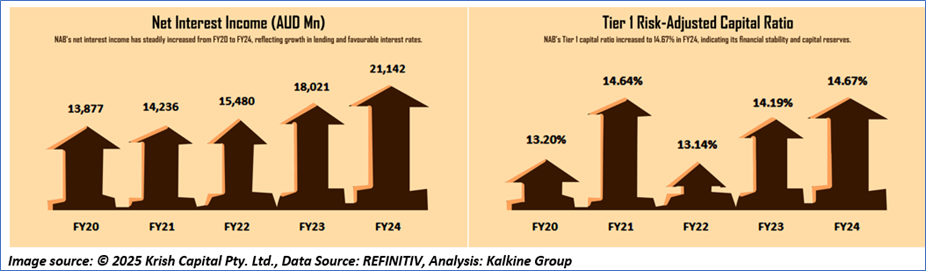 1.4: Key Metrics: NAB paid fully franked total dividends of 169 Australian cents per share for the year ended 30 September 2024, representing a 1.2% increase over 2023. Total dividends reflected a payout ratio of 73.7%, in line with the bank’s target payout ratio range of 65 to 75%. Below is captured the metrics showing the trend of net interest income and tier 1 risk-adjusted capital ratio since FY20: