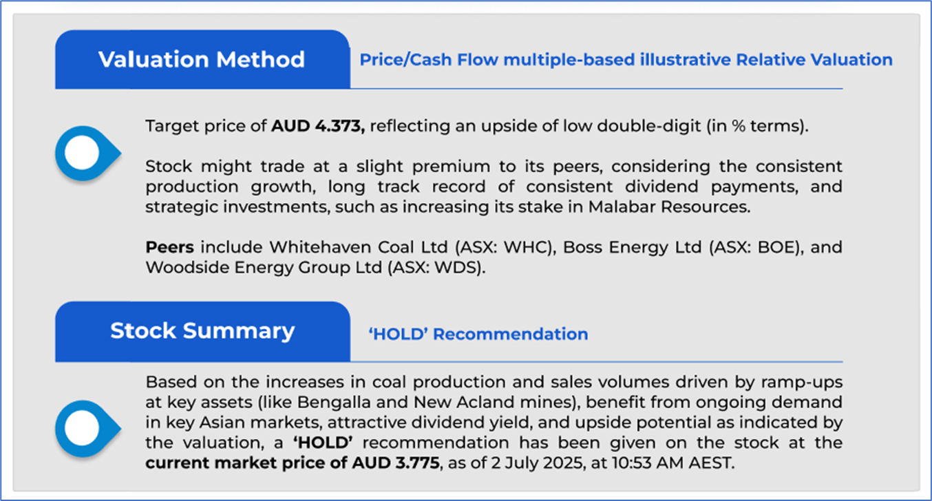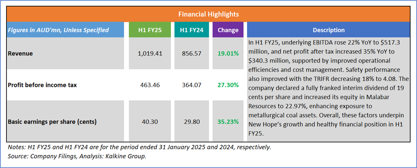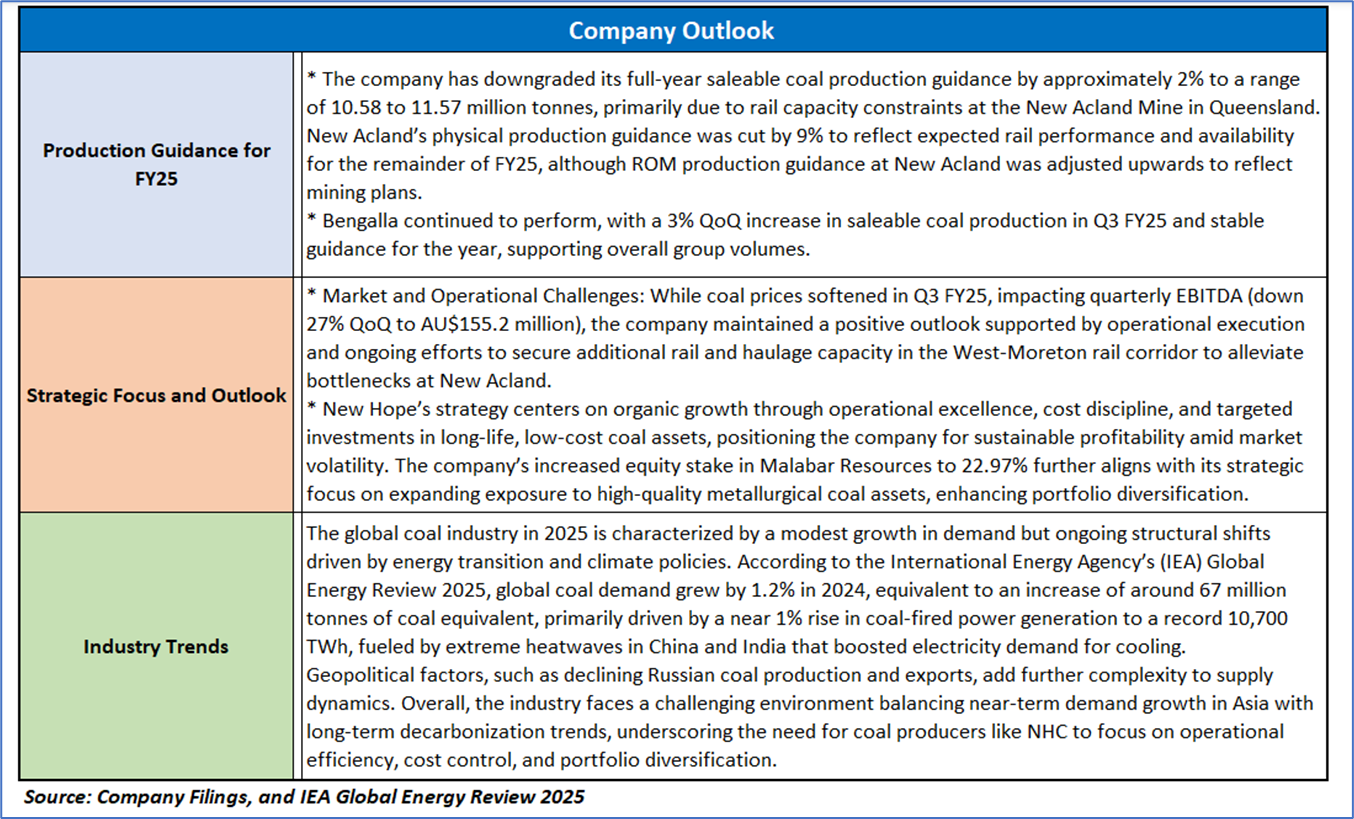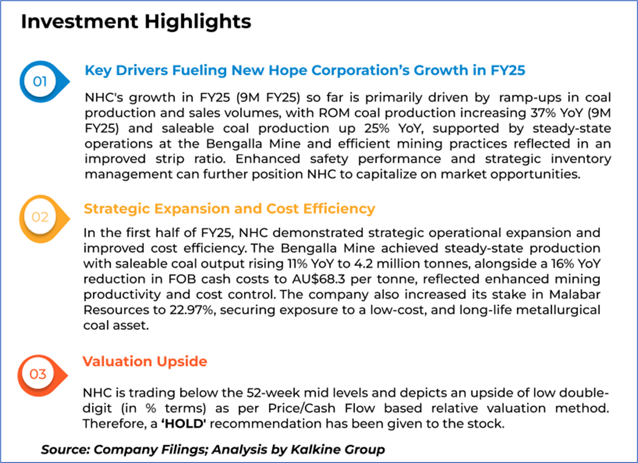 1.1 Company Overview: New Hope Corporation Limited (NHC) is an Australian diversified energy company primarily engaged in the exploration, development, production, and processing of coal and oil and gas properties. It operates mainly through three segments: Coal Mining in Queensland, Coal Mining in New South Wales, and other activities. The company owns and operates two major open-cut thermal coal mines—the New Acland project in Oakey, Queensland, and the Bengalla mine in the Hunter Valley, New South Wales. Kalkine’s Resources Report covers the Investment Highlights, Management Insights, Key Financial Metrics, Risks, Technical Analysis along with the Valuation, Target Price, and Recommendation on the stock.