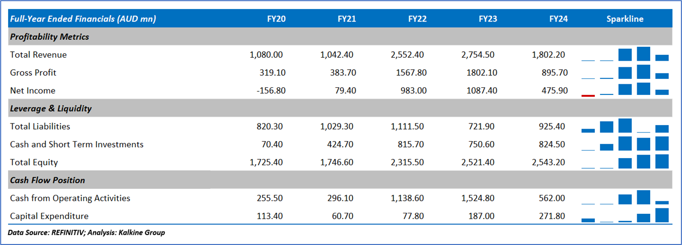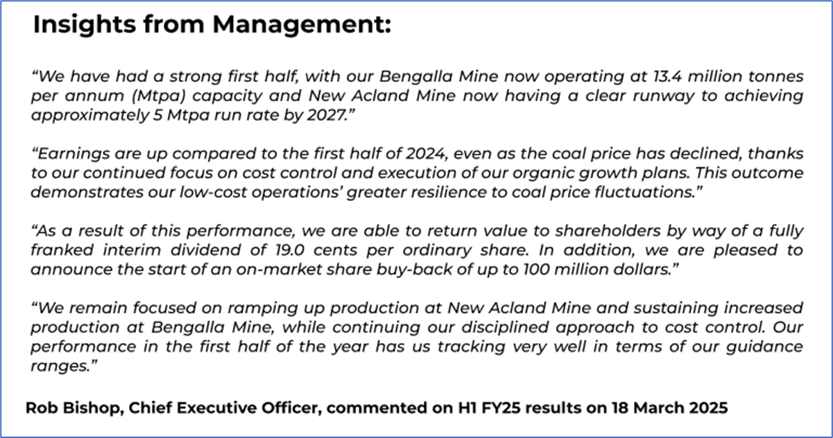 1.4 Key Metrics: From FY21 to FY24, New Hope Corporation’s net margin and dividend yield trends were primarily influenced by a combination of operational growth and market pricing dynamics. During this period, the company increased coal production—supported by the ramp-up of the Bengalla Mine and the restart of New Acland Mine—leading to higher sales volumes. However, despite these volume gains, net margins compressed notably due to a sharp decline in coal prices and rising costs, including higher rail cancellations, labour, fuel, and consumables expenses. The company’s disciplined cost control and focus on low-unit-cost assets helped sustain profitability and cash flow, supporting a relatively consistent dividend yield despite the payout cut. Below are captured some key metrics: