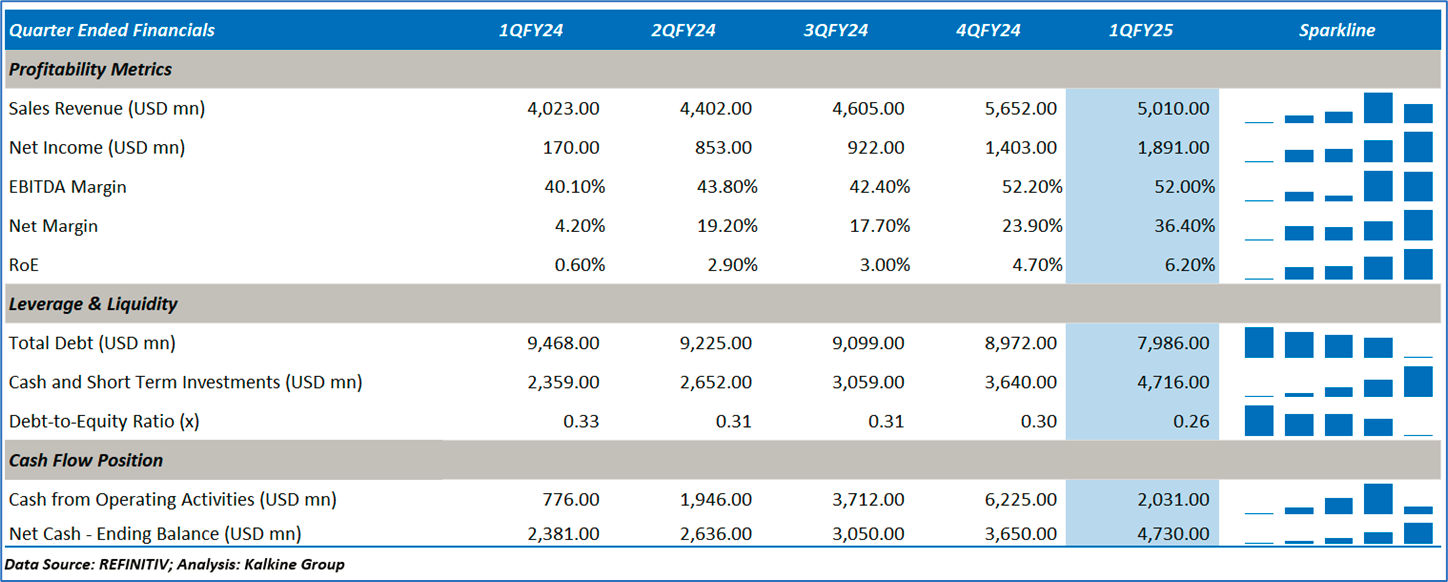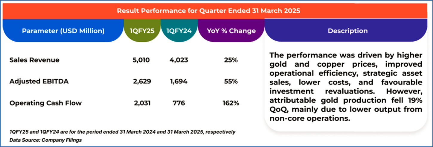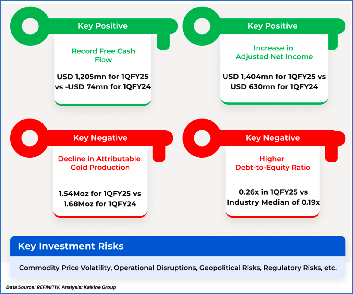 1.4: Key Metrics: NEM registered a return on equity of 6.2% in 1QFY25 compared with the industry median of 1.4%. Below is captured the metrics showing the trend of revenue and operating income since 1QFY24: