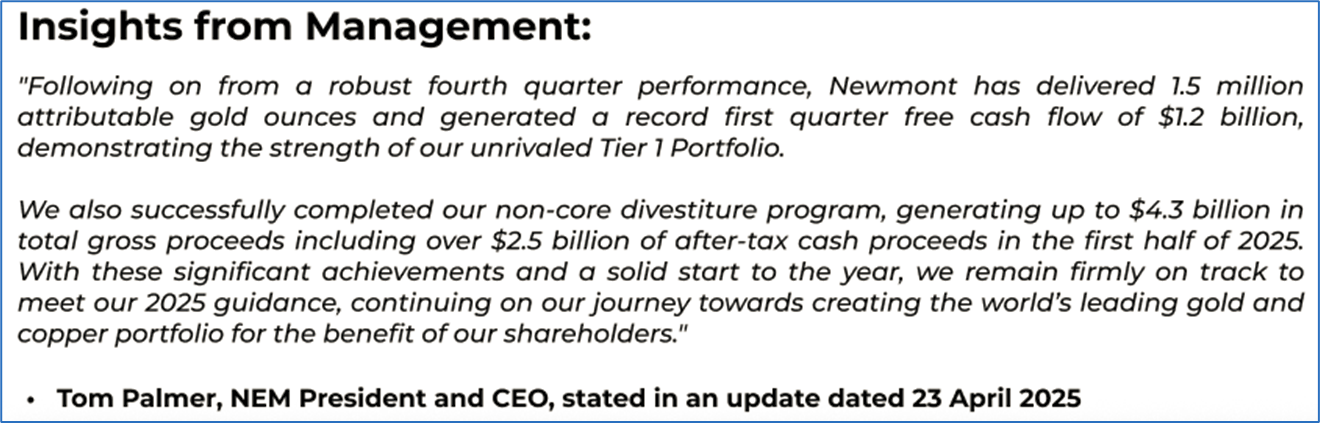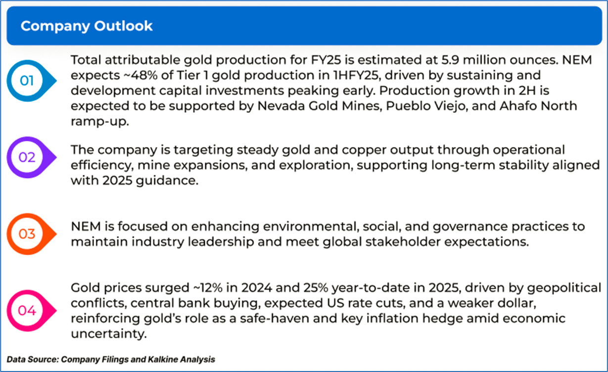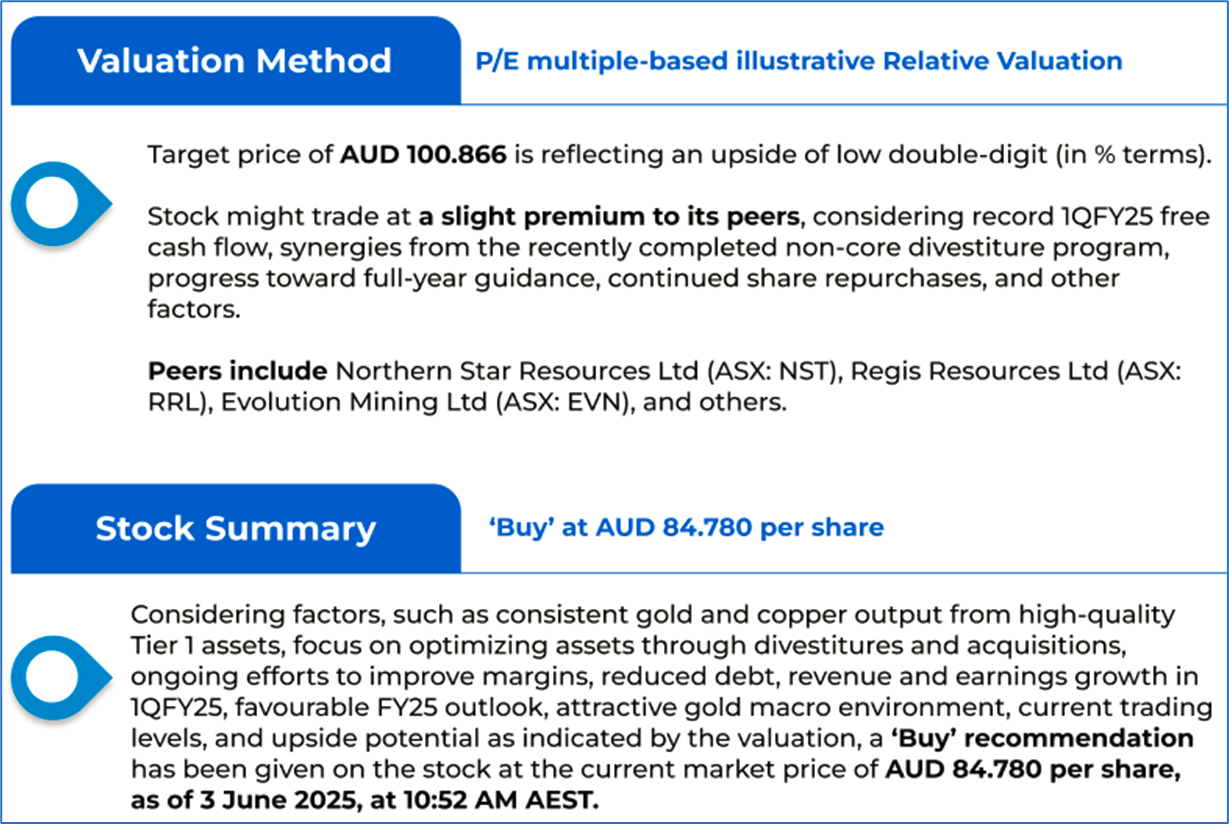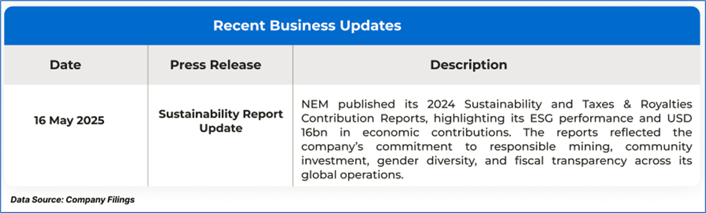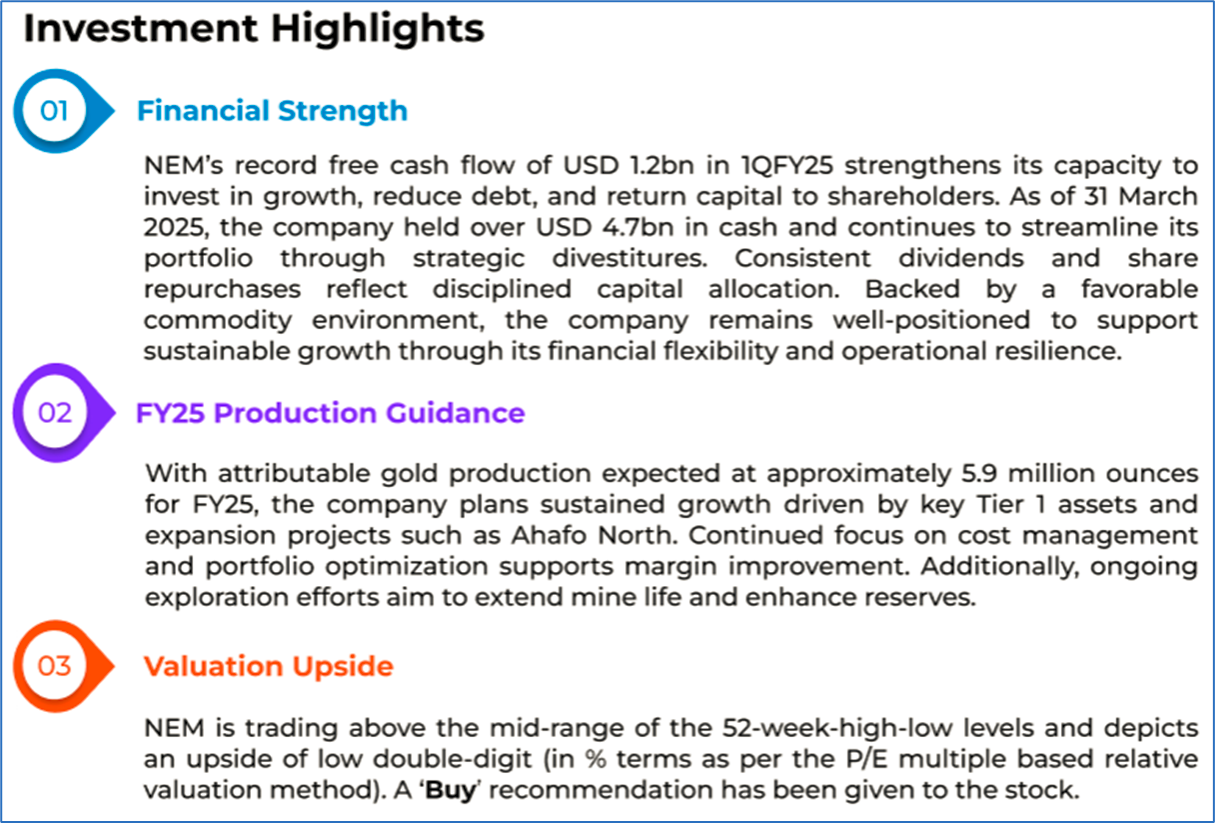 The stock price has gone up by ~4.25% in the last one month and over the last six months, stock prices increased by ~34.87%. The stock has a 52-week low and 52-week high of AUD 58.920 and AUD 88.930, respectively, and is currently trading above the mid-range of the 52-week-high-low levels. NEM was last covered in a report dated ’11 April 2025’.