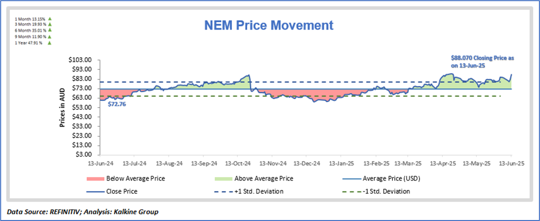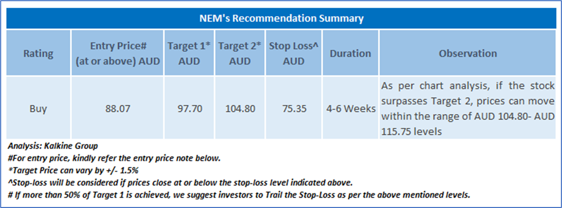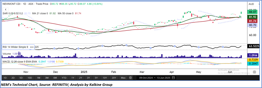 As per the above-mentioned price action and technical indicators analysis, a ‘Buy’ rating has been given on Newmont Corporation (ASX: NEM) at closing price of AUD 88.07 as on June 13, 2025.