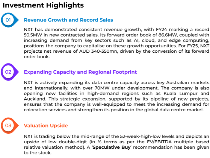 1.1: Company Overview: NEXTDC Limited (ASX: NXT) is a Data Centre-as-a-Service provider. The ASX-listed company is engaged in delivering critical power, security and connectivity for global cloud computing providers, enterprises, and government entities. Kalkine’s Technology Report covers the Investment Highlights, Management Insights, Key Financial Metrics, Risks, Technical Analysis along with the Valuation, Target Price, and Recommendation on the stock.