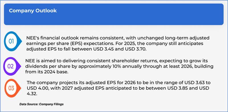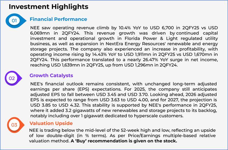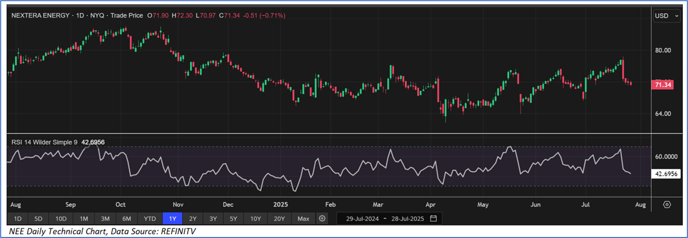 The stock has declined by ~3.37% in the last six months, whereas over the last nine months, the stock has decreased by ~13.91%. The stock has a 52-week low and 52-week high of USD 61.72 and USD 86.10, respectively, and is currently trading below the average of 52-week high and low. NEE was last covered in a report dated ‘20 May 2025