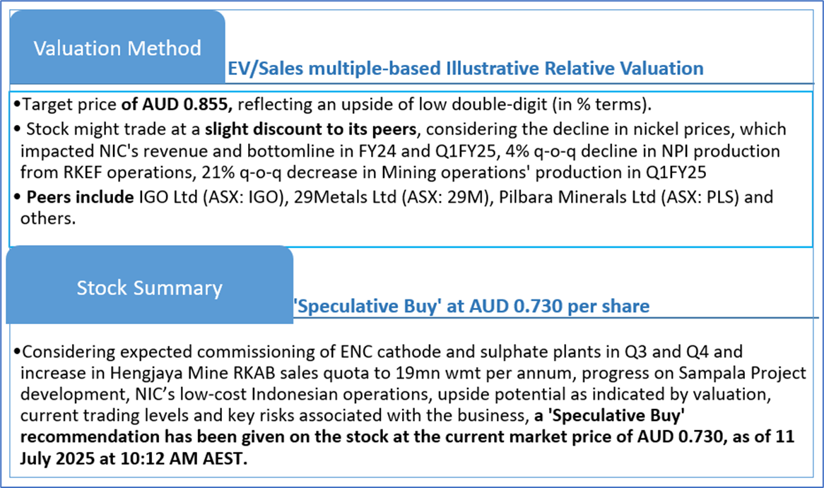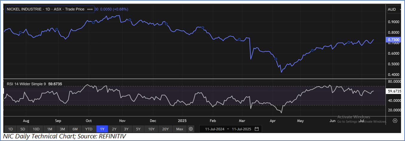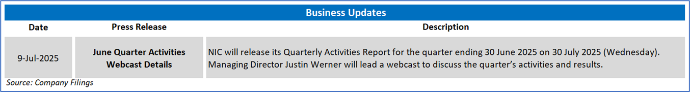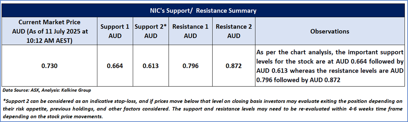 The stock price has increased by ~2.77% in the last one month, whereas over the last six months, it has declined by ~7.47%. The stock has a 52-week low and 52-week high of AUD 0.420 and AUD 0.995, respectively, and is currently trading above the midpoints of its 52-week low and 52-week high. NIC was last covered in a report dated ‘20 May 2025’.