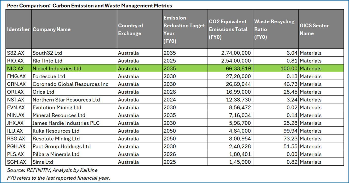 The peer comparison chart below highlighted Nickel Industries Ltd as a top performer in environmental sustainability among Australian materials companies. NIC reported comparatively low CO₂ emissions of 6.63 million tonnes, reflecting its strong focus on low-emission nickel production, as detailed in its recent sustainability reports. Notably, it achieved a 100% waste recycling ratio, the highest among all peers, indicating that no operational waste is sent to landfill. This aligns with NIC’s initiatives like solar energy adoption, electric haul trucks, and biodiversity conservation. With a 2035 emissions reduction target, NIC demonstrates a strong long-term commitment to sustainability while outperforming many industry giants in both carbon and waste management efficiency.