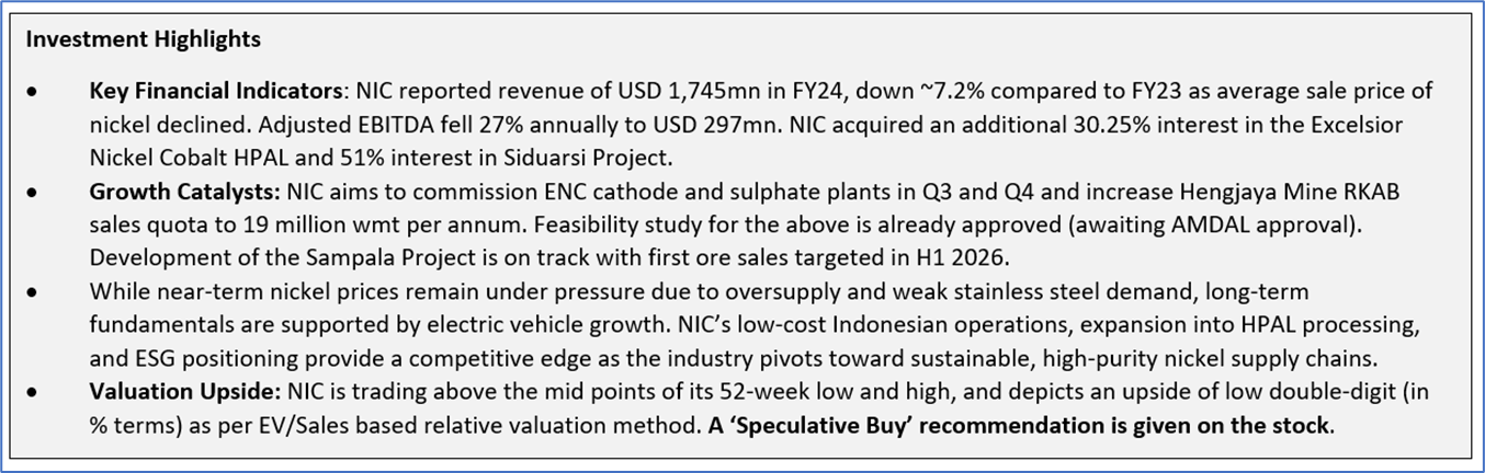 Section 1.1: Nickel Industries Limited (ASX: NIC) is an ASX-listed nickel ore mining and nickel pig iron production company with operations in Singapore and Indonesia. It holds an 80% stake in the Hengjaya Mine, Ranger Nickel project and in the Angel Nickel project. Kalkine’s Low Carbon Research Report covers the Investment Highlights, Low Carbon Emission Initiatives, Key Financial Metrics, Risks, and Technical Analysis along with the Valuation, Target Price, and Recommendation on the stock.