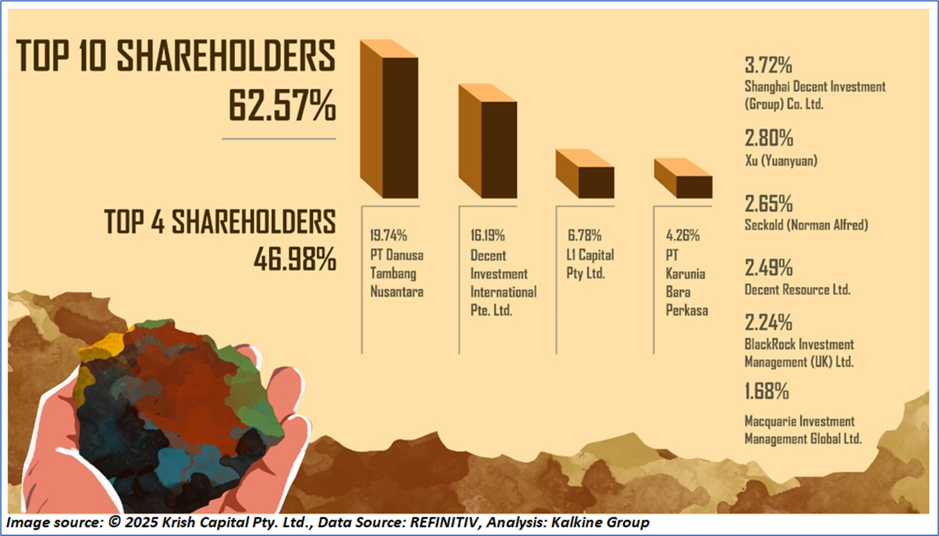 The top 10 shareholders together form ~62.57% of the total shareholding. PT Danusa Tambang Nusantara and Decent Investment International Pte. Ltd., hold maximum stakes in the company at ~19.74% and ~16.19%, respectively.