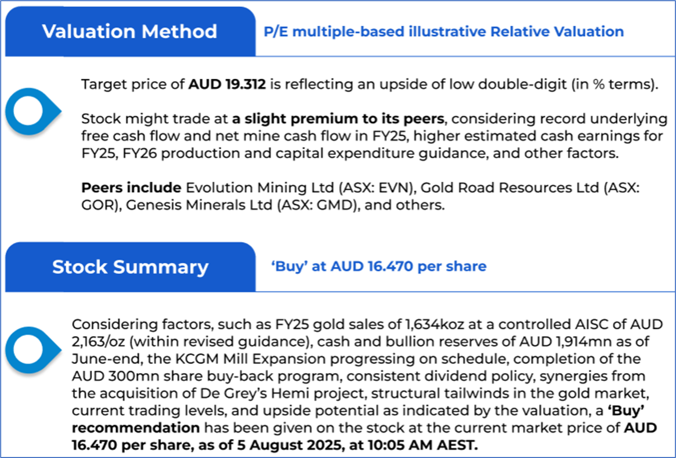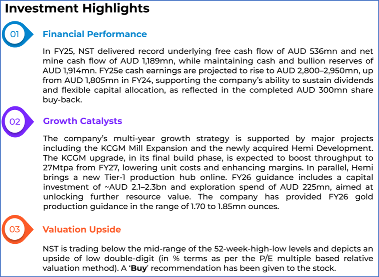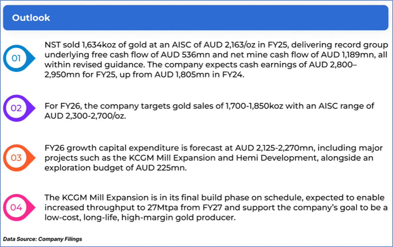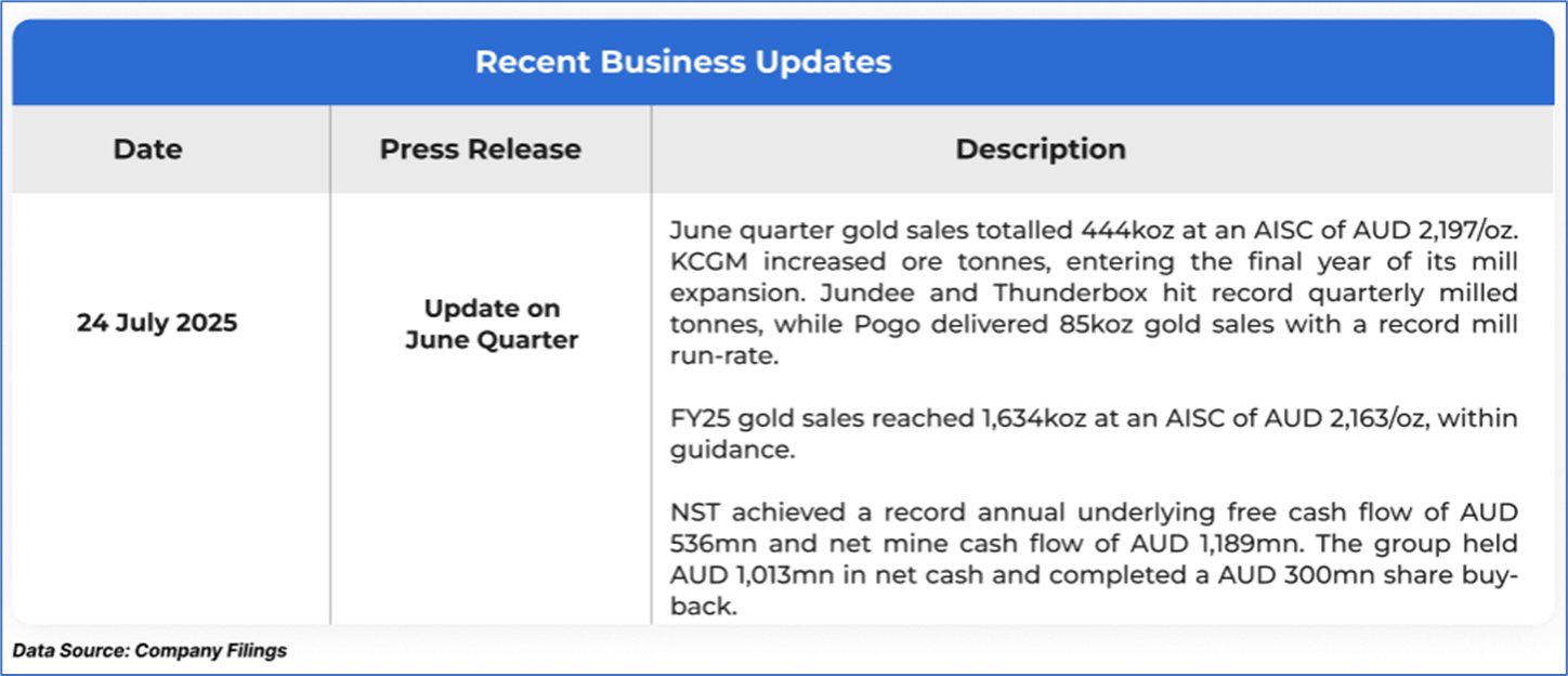 The stock price has gone down by ~1.90% in the last one month and over the last six months, stock prices declined by ~7.31%. The stock has a 52-week low and 52-week high of AUD 13.705 and AUD 23.300, respectively, and is currently trading below the mid-range of the 52-week-high-low levels. NST was last covered in a report dated ‘1 July 2025’.