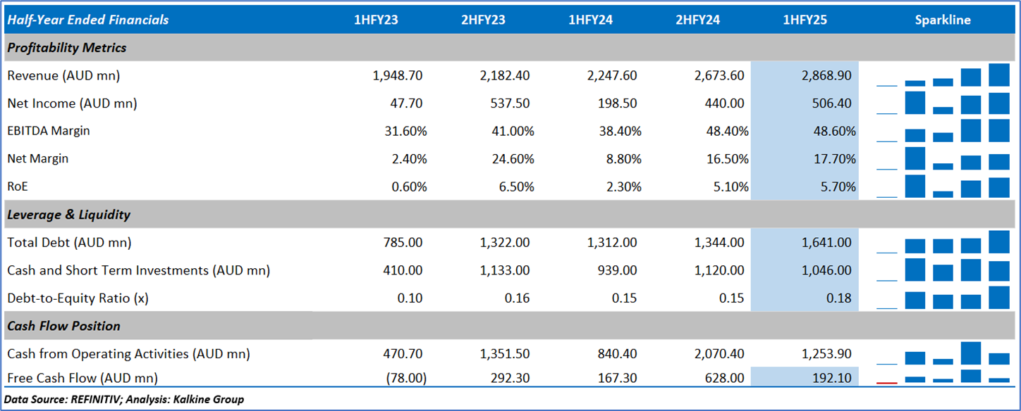 1.4: Key Metrics: NST recorded a 58% YoY increase in underlying EBITDA for 1HFY25, driven by higher gold sales and realised prices. Below is captured the metrics showing the trend of revenue and operating income since 1HFY23: