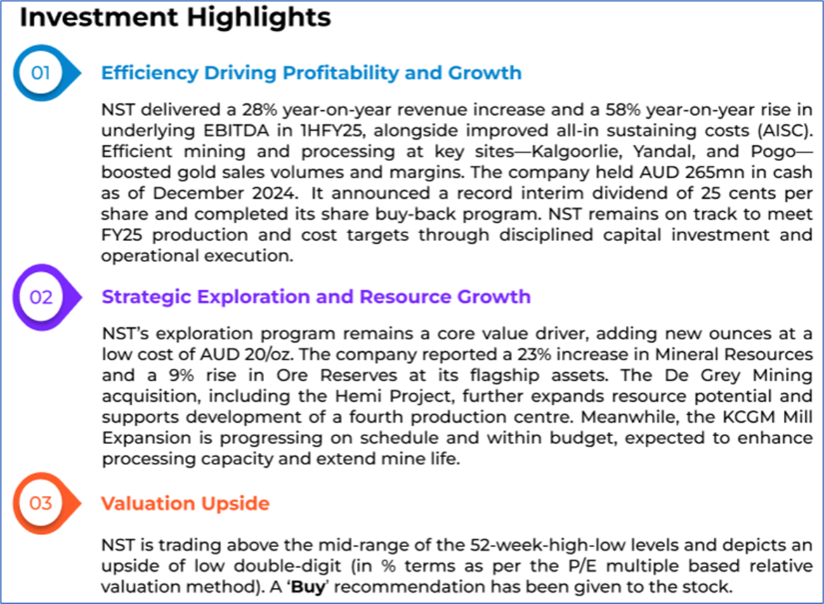The stock price has gone down by ~10.01% in the last one month and over the last six months, stock prices increased by ~21.62%. The stock has a 52-week low and 52-week high of AUD 12.650 and AUD 23.300, respectively, and is currently trading above the mid-range of the 52-week-high-low levels. NST was last covered in a report dated ‘27 May 2025’.