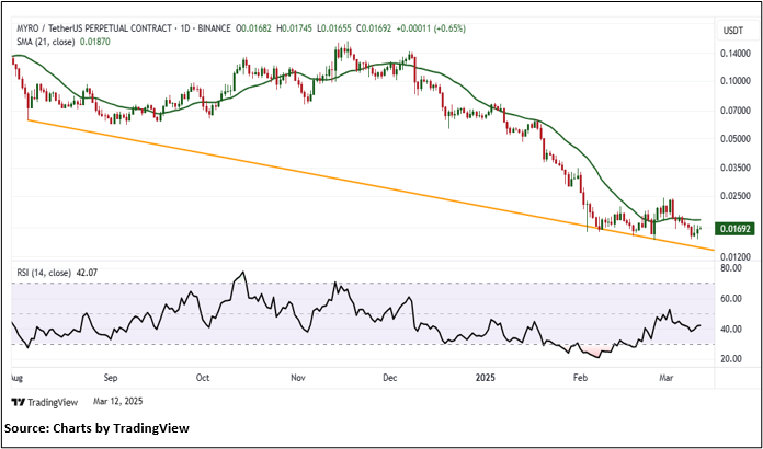 On the daily chart, MYRO is holding support above the downward-sloping trendline near USD 0.01370, indicating a slightly positive bias in price action. The 14-period Relative Strength Index (RSI) is around 42.07, suggesting a potential increase in reversal chances. However, MYRO remains below the 21-period Simple Moving Average (SMA), which may serve as a key resistance level. A breakout above this moving average could signal a shift in momentum, strengthening the bullish outlook.