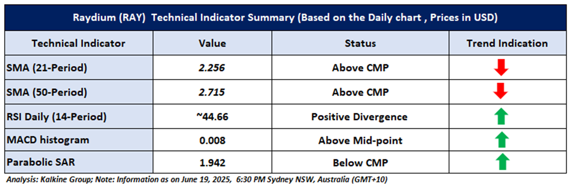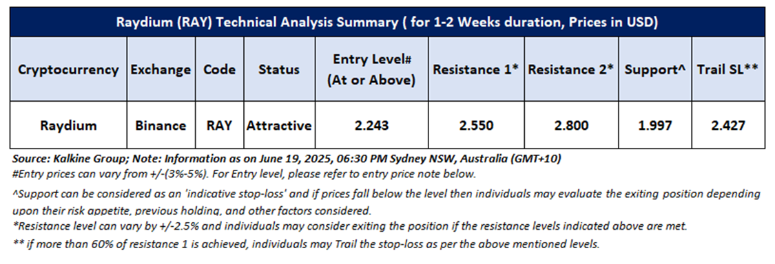 Based on the above-mentioned price action analysis and technical indicators outlook, Raydium (RAY) may witness movement in the upside direction. The trend looks to be in an interesting space and the currency looks ‘Attractive’ given the current price of USD 2.243 as on June 19, 2025, at 6:30 PM, (GMT+10) Time in Sydney NSW, Australia. However, volatility in the price should be borne in mind when looking at further evaluation for investment scenarios. Markets are trading in a highly volatile zone currently due to certain macro-economic issues and geopolitical tensions prevailing. Therefore, it is prudent to follow a cautious approach while making investment decisions.