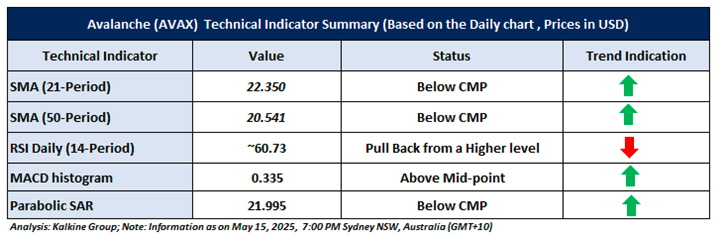 Based on the above-mentioned price action analysis and technical indicators outlook, Avalanche (AVAX) may witness movement in the downside direction. The trend looks to be in an interesting space and the currency looks ‘Non-Attractive’ given the current price of USD 24.50 as on May 15, 2025, at 07:00 PM, (GMT+10) Time in Sydney NSW, Australia. However, volatility in the price should be borne in mind when looking at further evaluation for investment scenarios. Markets are trading in a highly volatile zone currently due to certain macro-economic issues and geopolitical tensions prevailing. Therefore, it is prudent to follow a cautious approach while making investment decisions.