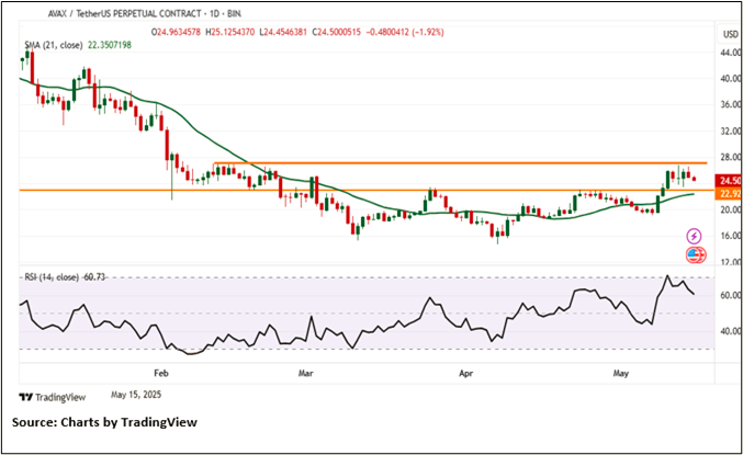 On the daily chart, AVAX is trading below a key horizontal trendline resistan ce at $26.550, maintaining a bearish bias and indicating potential for further downside. This resistance level has proven to be a strong barrier, reinforcing the likelihood of sustained selling pressure if not breached. The 14-period Relative Strength Index (RSI) is currently at 60.73, pulling back from higher levels. While this indicates some loss of momentum. Despite this, AVAX continues to hold above its 21-period Simple Moving Average (SMA), which serves as dynamic support.