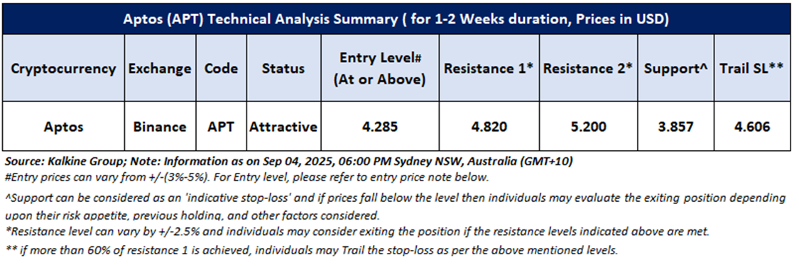 Based on the above-mentioned price action analysis and technical indicators outlook, Aptos (APT) may witness movement in the upside direction. The trend looks to be in an interesting space and the currency looks ‘Attractive’ given the current price of USD 4.285 as on September 04, 2025, at 6:00 PM, (GMT+10) Time in Sydney NSW, Australia. However, volatility in the price should be borne in mind when looking at further evaluation for investment scenarios. Markets are trading in a highly volatile zone currently due to certain macro-economic issues and geopolitical tensions prevailing. Therefore, it is prudent to follow a cautious approach while making investment decisions.