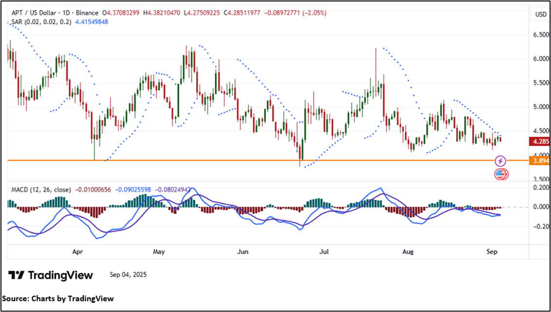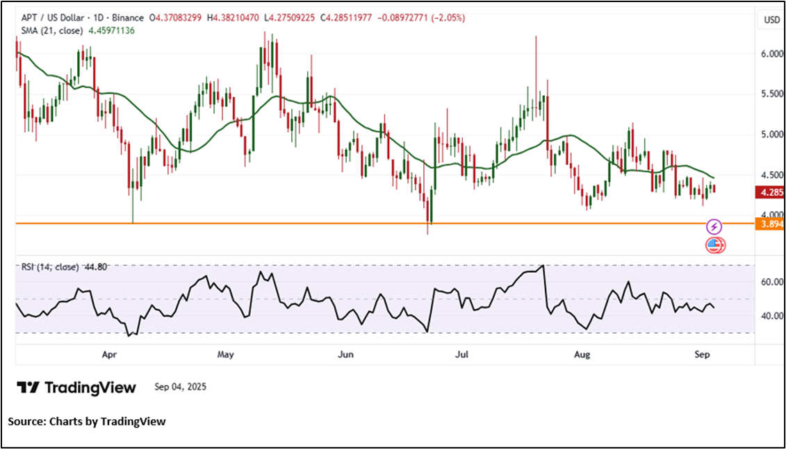 APT is trading above a key horizontal trendline support at $3.89, a historically significant level that has consistently curbed downside attempts. The price action is sustaining a positive bias and preserving upside momentum. The 14-period RSI currently stands at 44.80, indicating scope for further recovery in bullish momentum. However, APT remains below its 21-period Simple Moving Average (SMA), which is acting as dynamic resistance and capping the near-term upside.