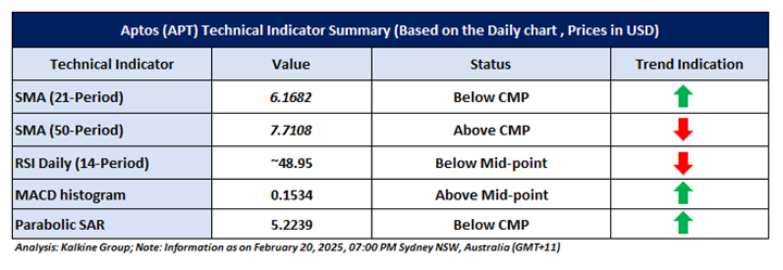 Based on the above-mentioned price action analysis and technical indicators outlook, Aptos (APT) may witness movement in an upside direction. The trend looks to be in an interesting space and the currency looks ‘Attractive’ given the current price of USD 6.5738 (as on February 20, 2025, at 07:00 PM, (GMT+11) Time in Sydney NSW, Australia. However, volatility in the price should be borne in mind when looking at further evaluation for investment scenarios. Markets are trading in a highly volatile zone currently due to certain macro-economic issues and geopolitical tensions prevailing. Therefore, it is prudent to follow a cautious approach while making investment decisions.