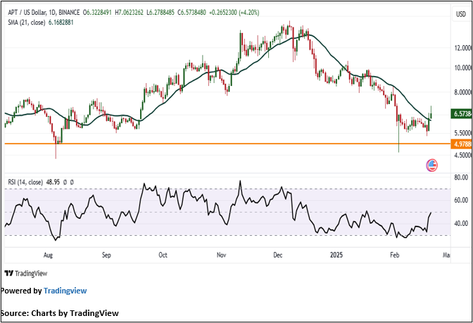 On the daily chart, APT is holding above the horizontal trendline support at USD 4.978, signaling a positive bias in price action. The asset also remains above the 21-period SMA, which could serve as a support level. Meanwhile, the 14-period RSI stands at 49.35, indicating weak momentum but with the potential for recovery if buying pressure strengthens.