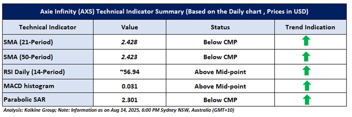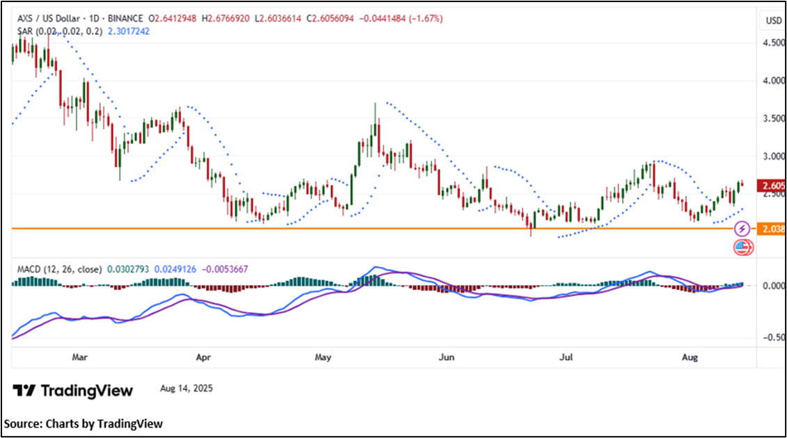 Based on the above-mentioned price action analysis and technical indicators outlook, Axie Infinity (AXS) may witness movement in the upside direction. The trend looks to be in an interesting space and the currency looks ‘Attractive’ given the current price of USD 2.605 as on August 14, 2025, at 6:00 PM, (GMT+10) Time in Sydney NSW, Australia. However, volatility in the price should be borne in mind when looking at further evaluation for investment scenarios. Markets are trading in a highly volatile zone currently due to certain macro-economic issues and geopolitical tensions prevailing. Therefore, it is prudent to follow a cautious approach while making investment decisions.