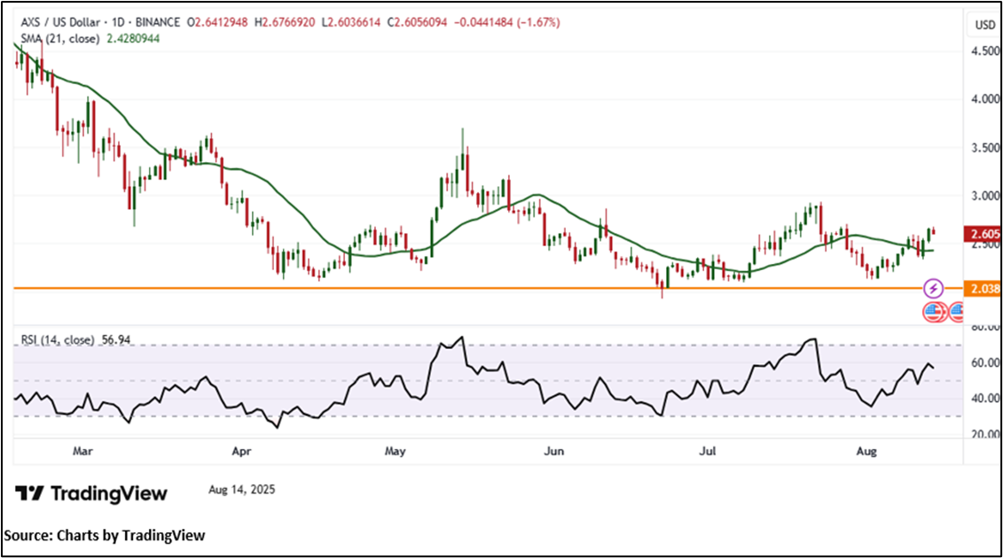 AXS is trading above a key horizontal trendline support at $2.038, a historically significant price floor that has repeatedly held in the past. Maintaining this level is essential for sustaining the current bullish bias and preserving upward momentum. The 14-period RSI stands at 57.79, rebounding from lower levels and signaling room for further upside. Price action also remains above the 21-period SMA, which continues to serve as dynamic support.