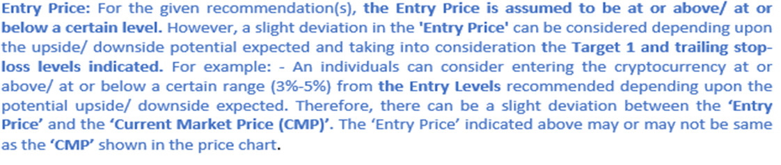A trailing stop-loss is a modification of stop-loss in case of favourable movement in the price to protect the gains. It is suggested to Trail the Stop-Loss as per the aforementioned levels if the Cryptocurrency price achieves more than 60% of the Resistance 1. individuals, in general, might consider exiting from the position as per the Trailing Stop-Loss level if the price starts moving downwards after achieving more than 60% of Resistance 1. However, these indications need further evaluation basis associated risks and any change in trends.