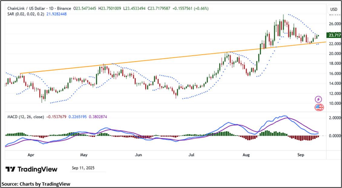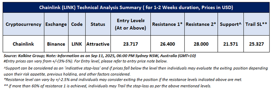 Based on the above-mentioned price action analysis and technical indicators outlook, Chainlink (LINK) may witness movement in the upside direction. The trend looks to be in an interesting space and the currency looks ‘Attractive’ given the current price of USD 23.717 as on September 11, 2025, at 6:00 PM, (GMT+10) Time in Sydney NSW, Australia. However, volatility in the price should be borne in mind when looking at further evaluation for investment scenarios. Markets are trading in a highly volatile zone currently due to certain macro-economic issues and geopolitical tensions prevailing. Therefore, it is prudent to follow a cautious approach while making investment decisions.