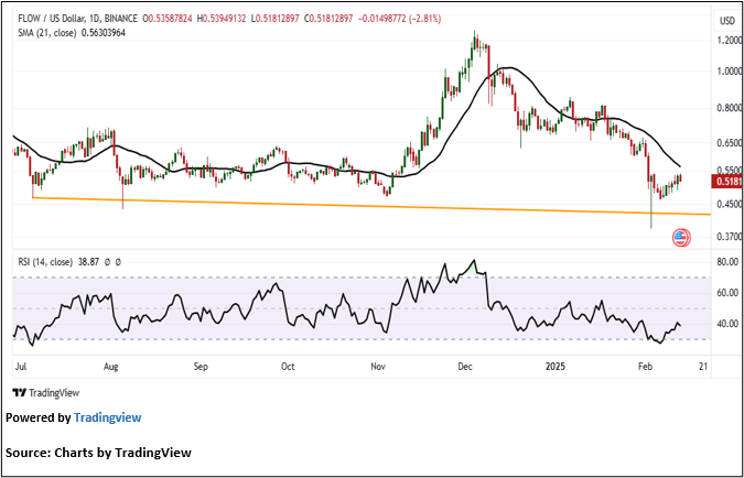 On the daily chart, FLOW is trading above the falling trendline support at USD 0.4345, indicating a positive bias in price action. The 14-period RSI is currently around 38.87, suggesting the asset is in a weak but potentially recovering momentum phase. However, FLOW remains below the 21-period SMA, which could act as a resistance level.