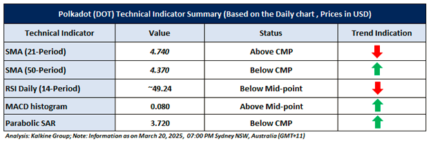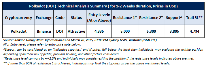 Based on the above-mentioned price action analysis and technical indicators outlook, Polkadot (DOT) may witness movement in an upside direction. The trend looks to be in an interesting space and the currency looks ‘Attractive’ given the current price of USD 4.47 (as on March 20, 2025, at 07:00 PM, (GMT+11) Time in Sydney NSW, Australia. However, volatility in the price should be borne in mind when looking at further evaluation for investment scenarios. Markets are trading in a highly volatile zone currently due to certain macro-economic issues and geopolitical tensions prevailing. Therefore, it is prudent to follow a cautious approach while making investment decisions.