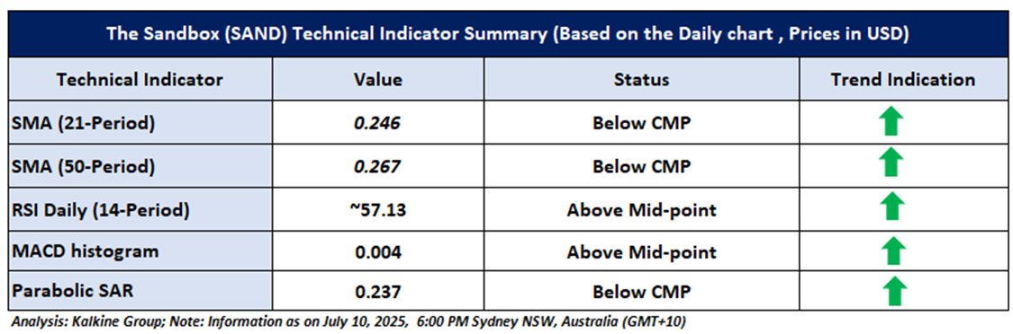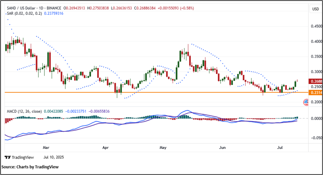 Based on the above-mentioned price action analysis and technical indicators outlook, The Sandbox (SAND) may witness movement in the upside direction. The trend looks to be in an interesting space and the currency looks ‘Attractive’ given the current price of USD 0.2688 as on July 10, 2025, at 6:00 PM, (GMT+10) Time in Sydney NSW, Australia. However, volatility in the price should be borne in mind when looking at further evaluation for investment scenarios. Markets are trading in a highly volatile zone currently due to certain macro-economic issues and geopolitical tensions prevailing. Therefore, it is prudent to follow a cautious approach while making investment decisions.