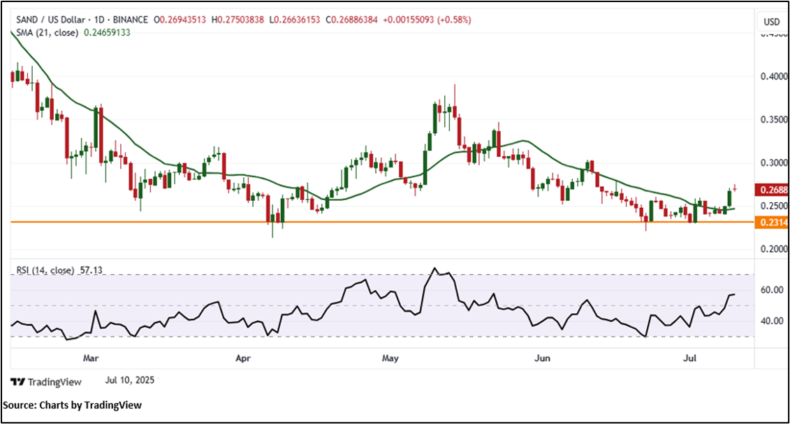SAND is currently trading above a key horizontal trendline support at $0.2314, a level that has historically acted as a strong floor for prices. This support zone remains a critical juncture for sustaining the upward move, reinforcing the bullish technical outlook. The 14-period Relative Strength Index (RSI) is at 57.13, indicating neutral-to-positive momentum. The price also continues to hold above the 21-period Simple Moving Average (SMA), which acts as dynamic support and underpins the prevailing bullish bias.