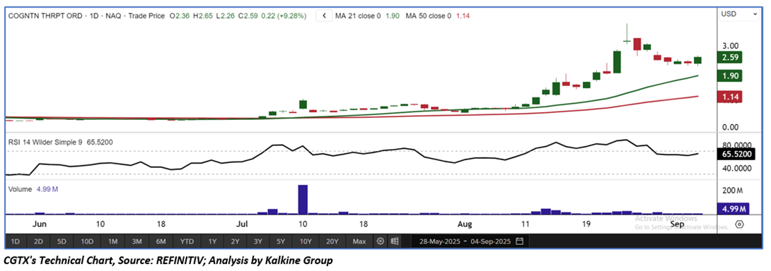 CGTX’s stock price held support at its key levels and closed near the session highs in the previous trading session, suggesting the possibility of further upward movement in the near term. A significant resistance level around USD 3.13 is approaching and could be tested within the next two to four weeks. If the price manages to break above USD 3.13, it may attract greater buying interest, potentially driving the stock to higher levels.