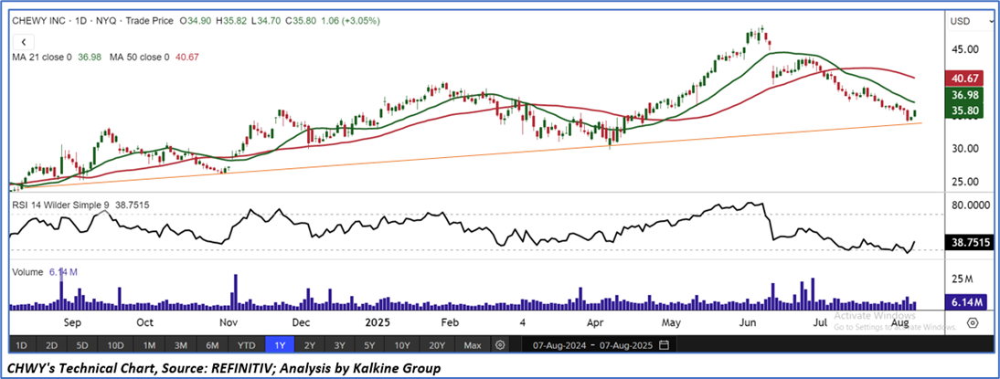 Company Overview: Chewy, Inc. (NYSE: CHWY) is a pure-play e-commerce company geared towards pet products and services for dogs, cats, fish, birds, small pets, horses, and reptiles. This Report covers the Price Action, Technical Indicators Analysis along with the Target Levels, Stop Loss, Support Levels, Resistance Levels, and Recommendation on stock.