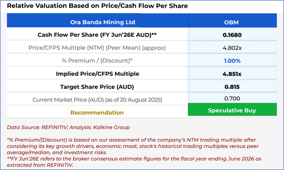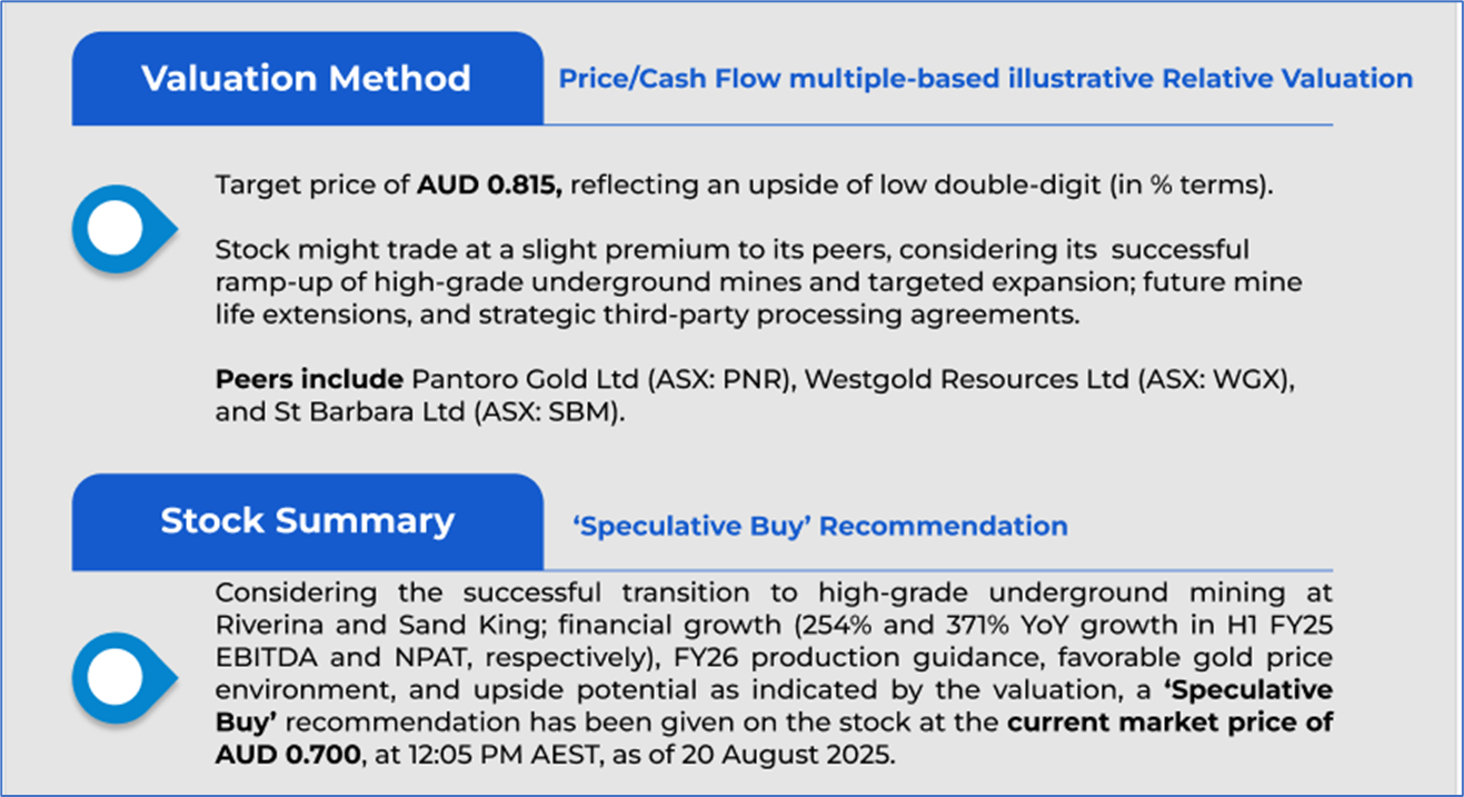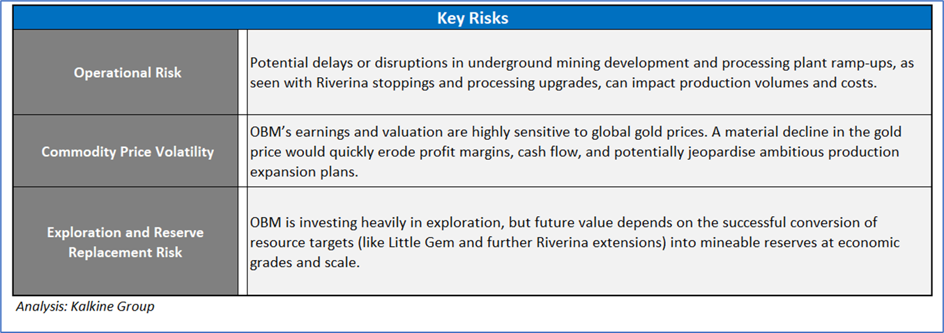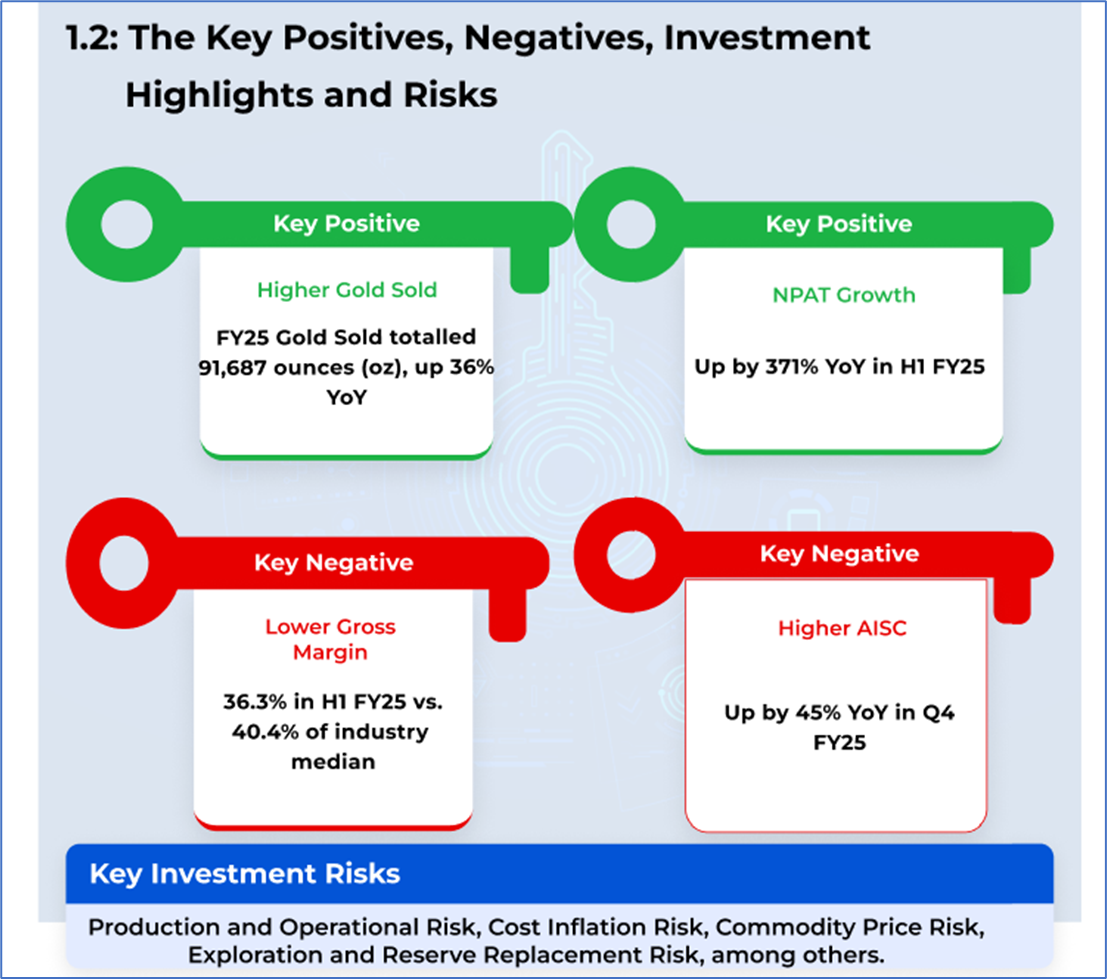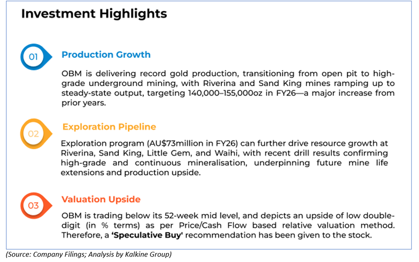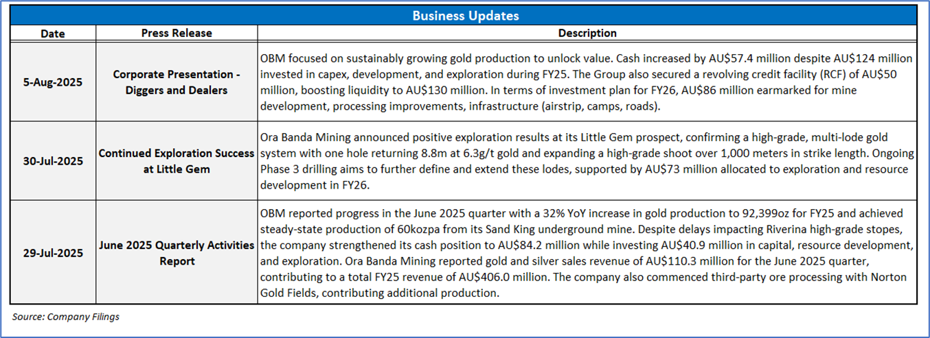 1.4 Key Metrics: The execution of an AU$50 million Syndicated Facility Agreement (SFA) with ANZ and CBA (2-year revolving credit facility with extension option) increased available liquidity in the quarter ended June 2025. For FY26, OBM has planned production ramp-up to 140-155koz, including ~21koz from third-party ore sales, which can add complexity and infrastructure needs; hence, it is likely to drive higher sustaining and operating costs. Below are captured the key metrics:
