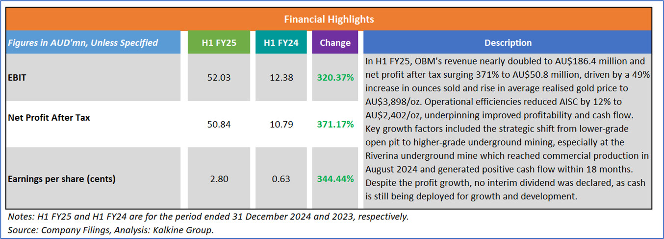 1.1 Company Overview: Ora Banda Mining Limited (ASX: OBM) is a gold exploration and production company based in Western Australia. The company owns a large, highly prospective landholding of over 1,000 square kilometers in the Eastern Goldfields region, centered around its Davyhurst processing hub. OBM is focused on developing a sustainable and scalable gold mining operation through a combination of underground and open-pit mining, strategic exploration, and targeted capital investment. Its key assets include the Riverina and Sand King underground mines, and the company continues to expand its resource base through aggressive exploration and feasibility studies aimed at boosting production capacity and mines’ life. Kalkine’s Resources Report covers the Investment Highlights, Management Insights, Key Financial Metrics, Risks, Technical Analysis along with the Valuation, Target Price, and Recommendation on the stock.