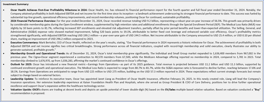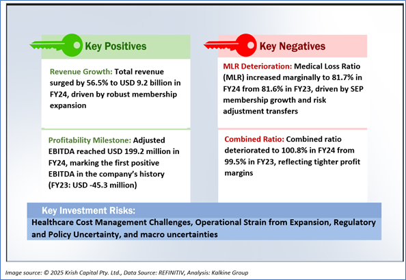 Oscar Health, Inc. exhibited robust revenue growth, achieving a four-year CAGR of 81.74%, with revenue rising from USD 462.8 million in 2020 to USD 9,177.56 million in 2024. Despite recording consistent net losses between 2020 and 2023, the company transitioned to profitability in 2024, reporting a net income of USD 26.1 million compared to a net loss of USD 270.6 million in 2023, reflecting significant operational improvements.