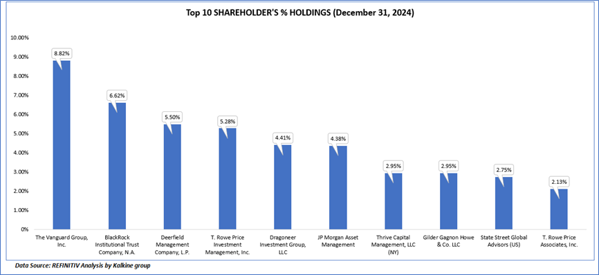 The top 10 shareholders together form ~45.79% of the total shareholding, signifying concentrated shareholding. The Vanguard Group, Inc., and BlackRock Institutional Trust Company, N.A., are the biggest shareholders, holding the maximum stake in the company at 8.82% and 6.62%, respectively.