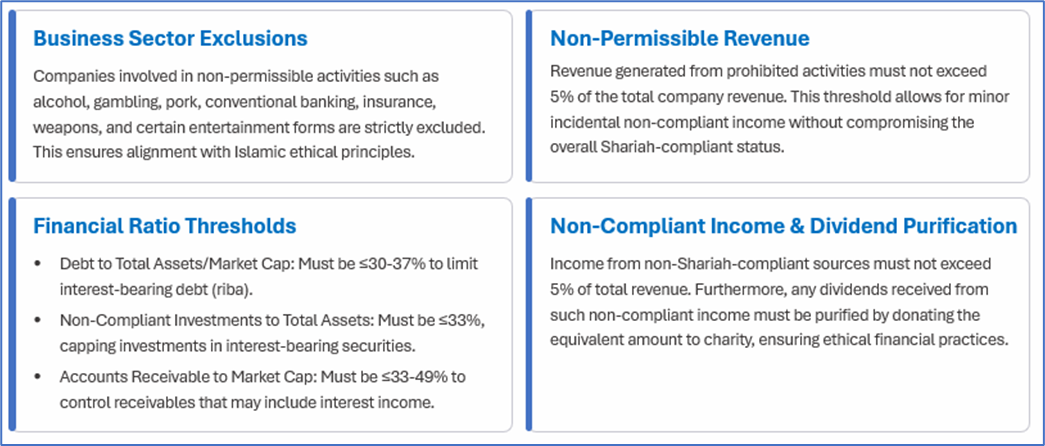 The Shariah Compliance Report aims to identify equities that align with Shariah and ethical principles, providing valuable insights on financial metrics, business activities and compliance with Islamic finance norms.