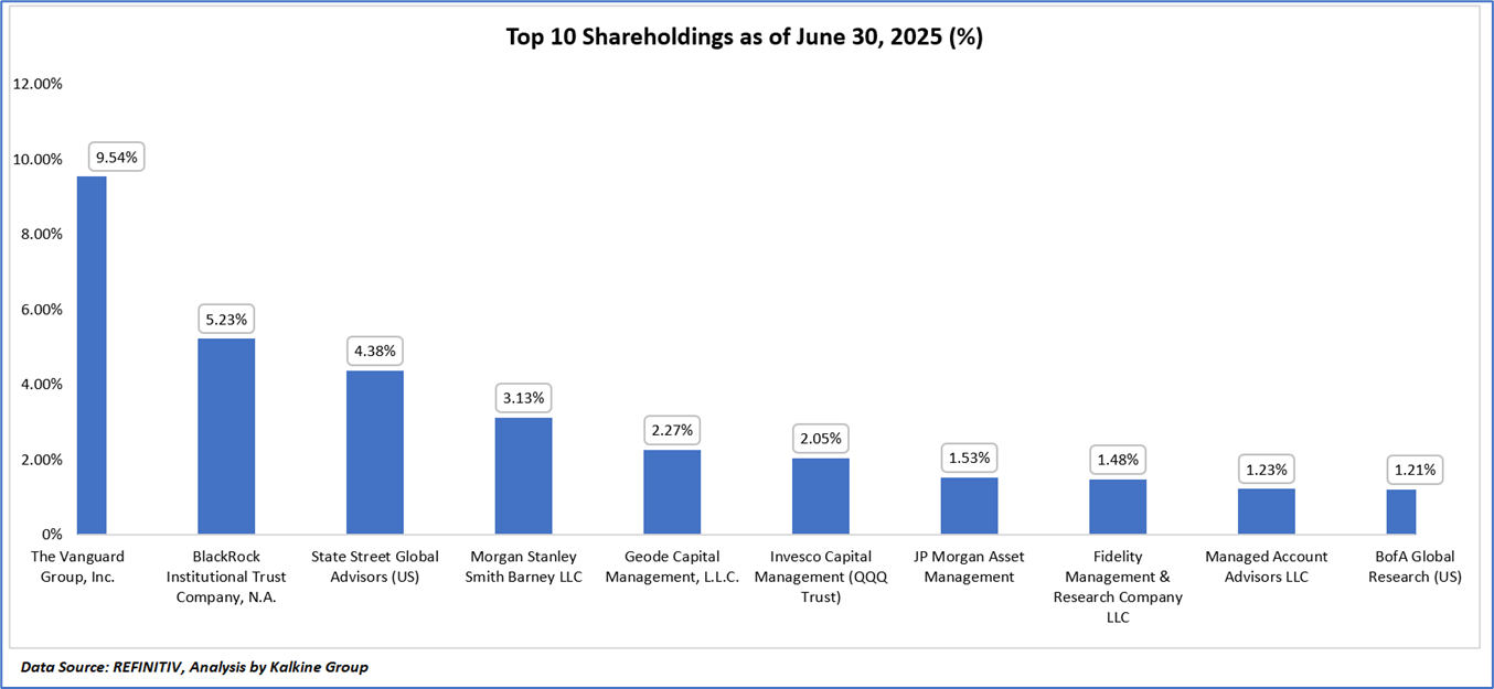 The top 10 shareholders together form ~32.06% of the total shareholding, signifying concentrated shareholding. The Vanguard Group, Inc., and BlackRock Institutional Trust Company, N.A. are the biggest shareholders, holding the maximum stake in the company at ~9.54% and ~5.23%, respectively.