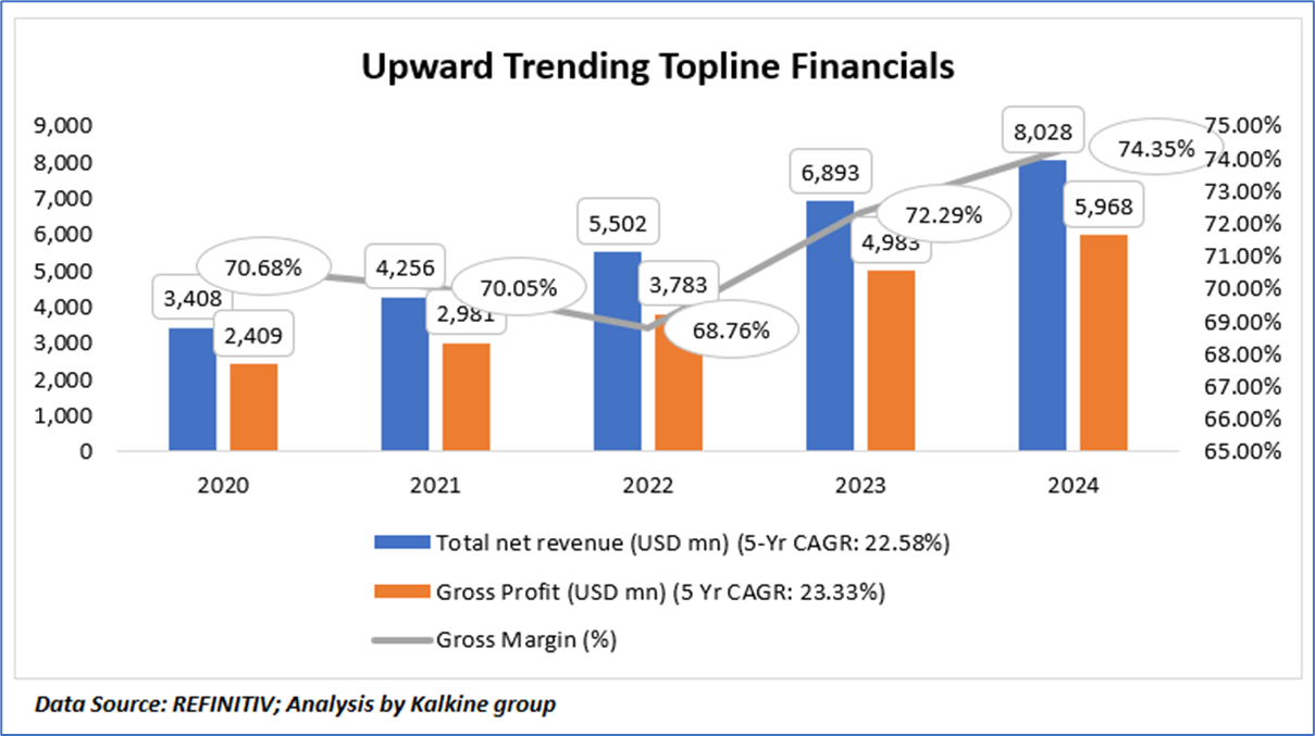Palo Alto Networks, Inc. exhibited robust financial growth from fiscal year 2020 to 2024, with total net revenue escalating from USD 3,408 million to USD 8,028 million, achieving a commendable five-year annual growth rate (CAGR) of 22.58%, driven by expanding demand for its cybersecurity solutions amid rising digital threats and AI adoption. Concurrently, gross profit advanced from USD 2,409 million to USD 5,968 million, registering a slightly higher CAGR of 23.33%, indicative of enhanced operational efficiencies and favorable product mix shifts toward higher-margin subscription and software-based offerings. Gross margin, while experiencing a minor dip from 70.68% in 2020 to 68.76% in 2022—potentially attributable to increased costs from supply chain pressures or investments in innovations subsequently rebounded to 74.35% by 2024, underscoring the company's successful Platformization strategy and scale advantages that bolster profitability resilience in a competitive landscape.
