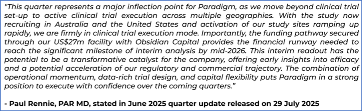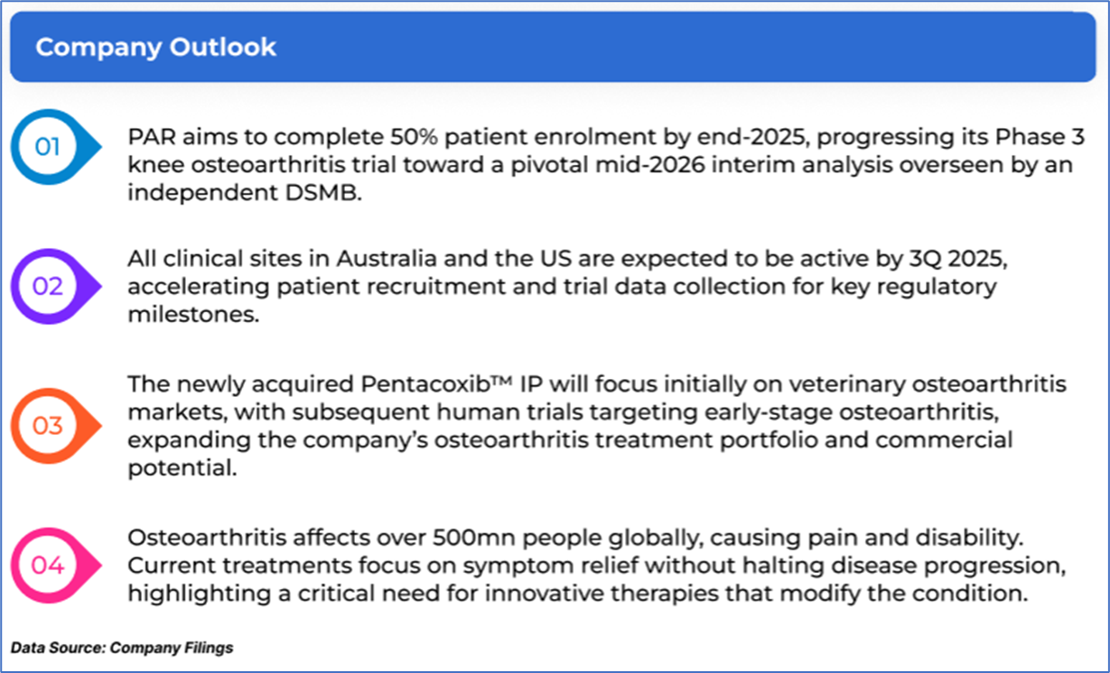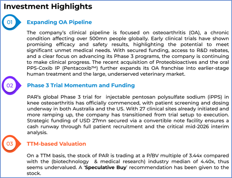 1.1: Company Overview: Paradigm Biopharmaceuticals Limited (ASX: PAR) is a global, clinically advanced biopharma company developing pentosan polysulfate sodium (PPS) for osteoarthritis and other inflammatory diseases. With a Phase 3 lead asset, Zilosul®, the company targets major unmet medical needs globally. Headquartered in Melbourne, PAR operates across the US and the EU. Kalkine’s Healthcare Report covers the Investment Highlights, Management Insights, Key Financial Metrics, Risks, Technical Analysis along with TTM-based Valuation, Target Price, and Recommendation on the stock.