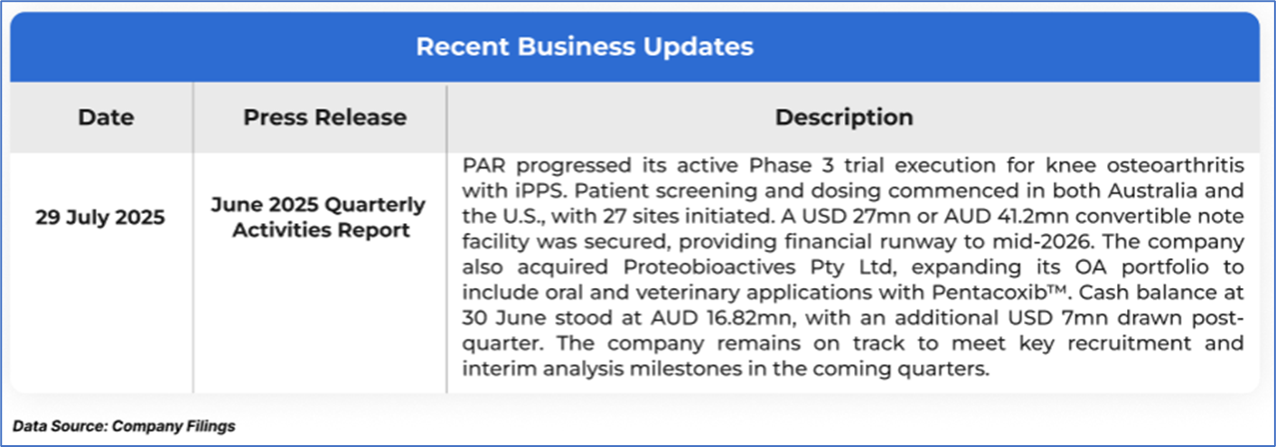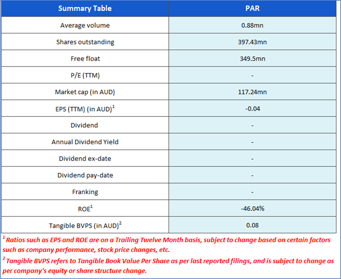 The stock price has gone down by ~28.10% in the last one month and over the last six months, stock prices declined by ~40.78%. The stock has a 52-week low and 52-week high of AUD 0.165 and AUD 0.660, respectively, and is currently trading below the average of the 52-week-high-low levels. PAR was last covered in a report dated ‘4 July 2025’.