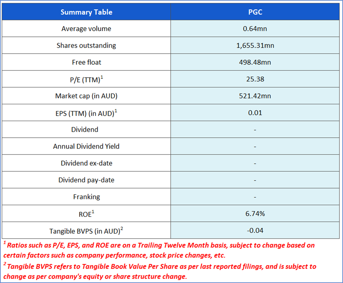 The stock price has gone down by ~16.67% in the last one month and over the last six months, stock prices declined by ~38.68%. The stock has a 52-week low and 52-week high of AUD 0.315 and AUD 0.590, respectively, and is currently trading near the 52-week-low level. PGC was last covered in a report dated ‘6 August 2025’.