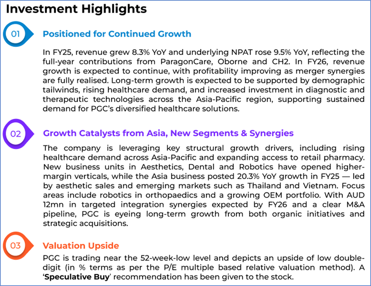 1.1: Company Overview: Paragon Care Limited (ASX:PGC) is an Australian healthcare company delivering medical equipment, devices, consumables, and pharmaceuticals. The company serves hospitals, aged care, veterinary, and diagnostic sectors across Australia, New Zealand, and Asia. PGC also provides equipment maintenance and distributes complementary medicines within the Australian healthcare market. Kalkine’s Healthcare Report covers the Investment Highlights, Management Insights, Key Financial Metrics, Risks, Technical Analysis along with the Valuation, Target Price, and Recommendation on the stock.