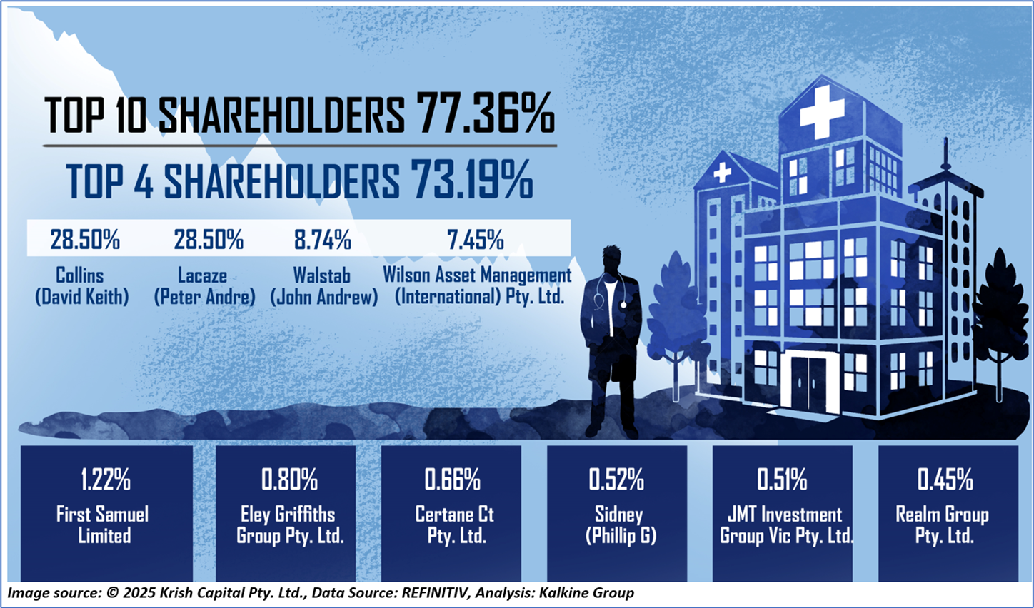 1.3: Top 10 Shareholders: The top 10 shareholders together form ~77.36% of the total shareholding. Collins (David Keith) and Lacaze (Peter Andre) are holding maximum stakes in the company at ~28.50% and ~28.50%, respectively.