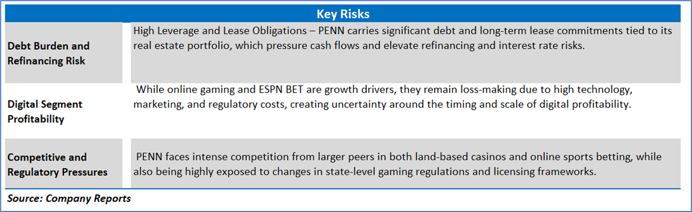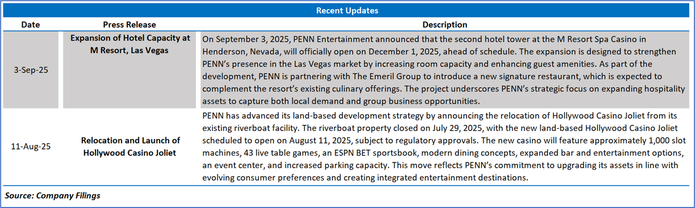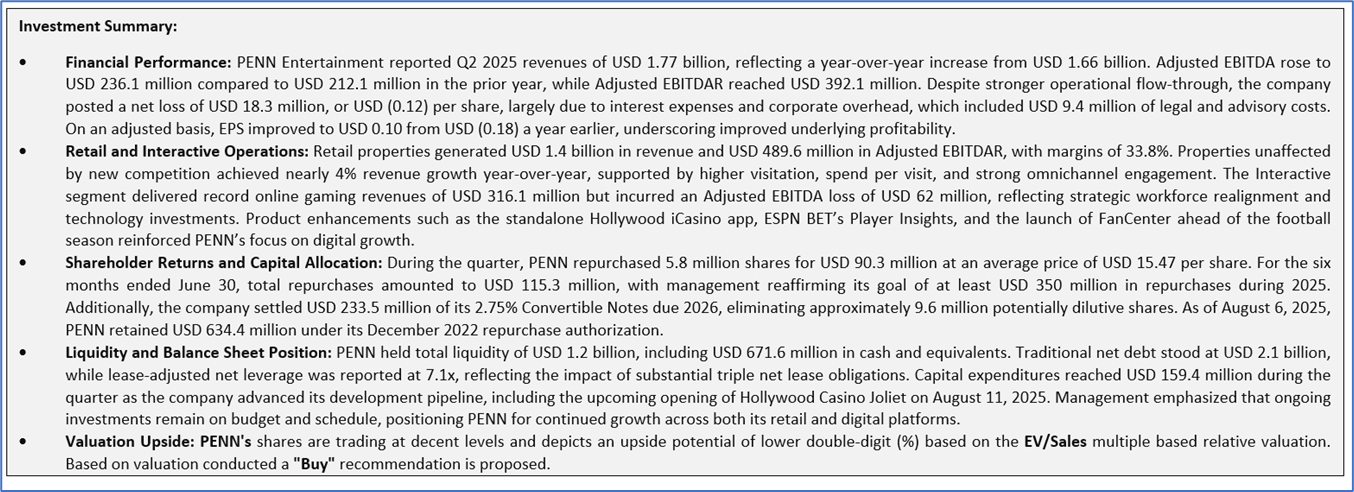 Company Overview: PENN Entertainment, Inc. (NASDAQ: PENN) is a provider of integrated entertainment, sports content, and casino gaming experiences. The Company operates in 28 jurisdictions throughout North America, with a broadly diversified portfolio of casinos, racetracks, and online sports betting and iCasino offerings under brands including Hollywood Casino, L’Auberge, ESPN BET, and theScore BET Sportsbook and Casino. Its segments include Northeast, South, West, Midwest, and Interactive.