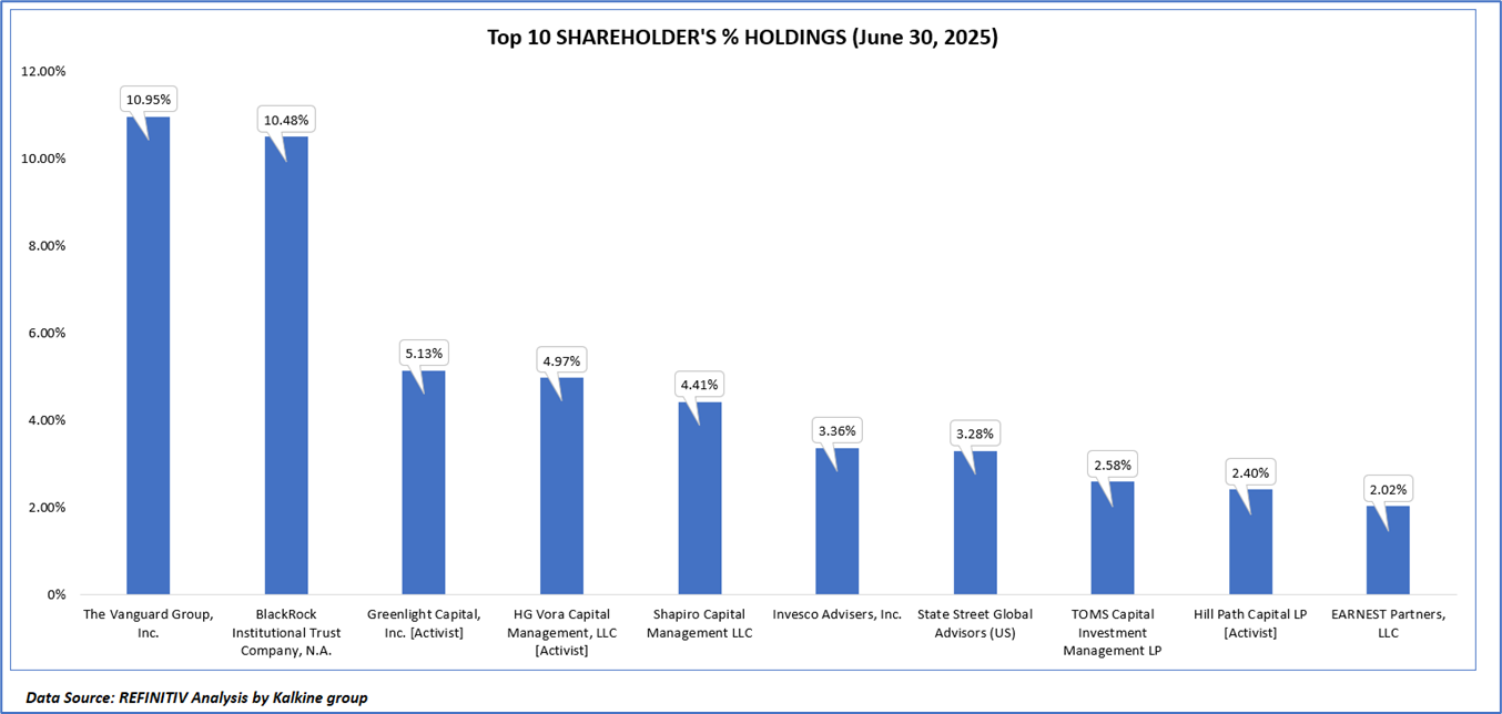 The top 10 shareholders together form ~49.57% of the total shareholding. The Vanguard Group, Inc., and BlackRock Institutional Trust Company, N.A. hold maximum stakes of 10.95% and 10.48%, respectively.