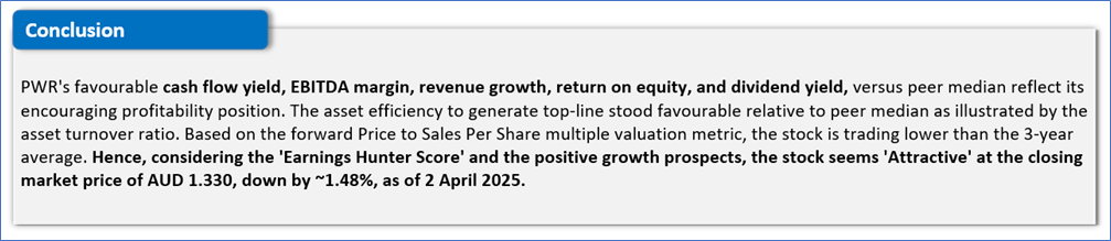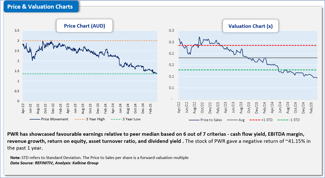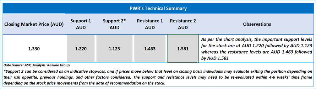 The stock has declined by ~19.88% in the last six months, and over the past one year, it has decreased by ~41.15%. The stock has a 52-week low and 52-week high of AUD 1.330 and AUD 2.300, respectively, and is currently trading at the 52-week-low average. PWR was last covered in a report dated ’12 February 2025’.