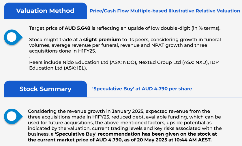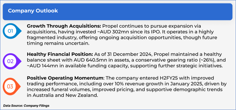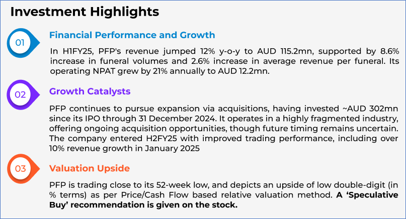 Company Overview: Propel Funeral Partners Limited (ASX: PFP) is an Australia-based company engaged in the provision of death care related services in Australia and New Zealand. It owns and operates businesses, properties, infrastructure, and related assets in Queensland, New South Wales, Victoria, Tasmania, South Australia, Western Australia, and New Zealand. Kalkine’s Growth Report covers the Investment Highlights, Management Insights, Key Financial Metrics, Risks, Technical Analysis along with the Valuation, Target Price, and Recommendation on the stock.
